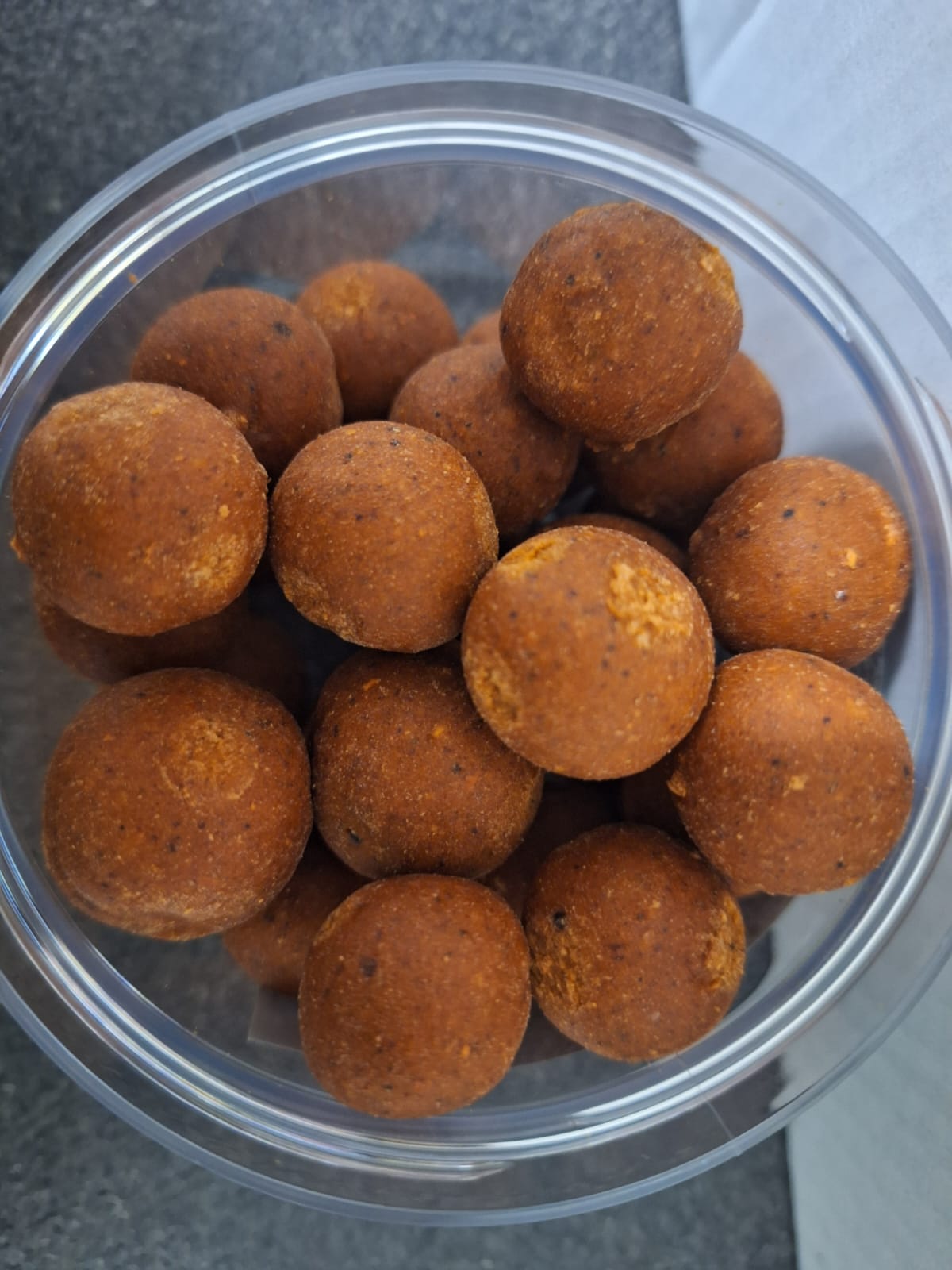 Meine auf dem All-Season aufgebauten Heavy Hookbaits in leichtem dunklem Rot/Braun werden aus den Mixen des Protein-Mix (50%), des Cereals-Mix 50% und einem Maximum an Attraktoren hergestellt.